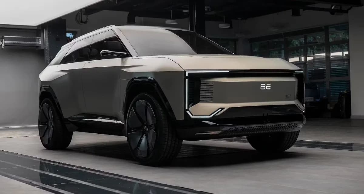 Inside, the BE.07 concept previewed a highly futuristic cabin with a wide triple-screen layout dominating the dashboard, complemented by a large panoramic sunroof and minimal physical buttons.